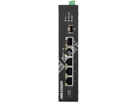 HikVision DS-3T0306HP-E/HS - Коммутатор Неуправляемый, 3 RJ45 100M PoE с грозозащитой 6кВ; ,1 100M порт поддерживает HiPoE 60Вт,1 1000М SFP порт, 1 RJ45 1000M Ethernet ; бюджет PoE 60Вт; поддержка режима передачи до 300м, таблица MAC адресов на 2000 записей; пропускная способность 4.8Гб/с; 48-57 VDC, 1.35 A; -30°C...+65°C.