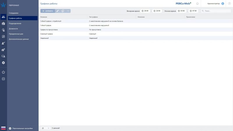 Создание, редактирование, назначение графиков (сменные, скользящие, пятидневка)