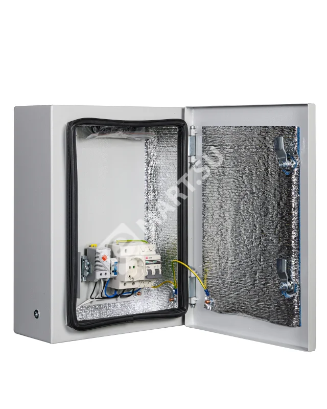 утеплитель из порилекса, замок 2 шт,ключ 1 шт, монтажная плата 1шт, гермовводы 2 шт (MG-25), розетка 1 шт, автоматический выключатель, 6А 1шт, клемма для подключения оборудования 2 шт, клемма заземления 1 шт, термореле 1шт, нагреватель мощностью 50 Вт 1шт.