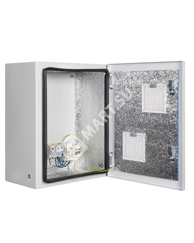 утеплитель из порилекса, замок 2 шт, ключ 1 шт, монтажная плата 1шт, гермовводы 2 шт (MG-25), розетка 1 шт, автоматический выключатель, 6А 1шт, клемма для подключения оборудования 2 шт, клемма заземления 1 шт, термореле 1шт, реле предстарта 1 шт, вентиляционная решётка с фильтром 2 шт, нагреватель мощностью 100 Вт 1шт.