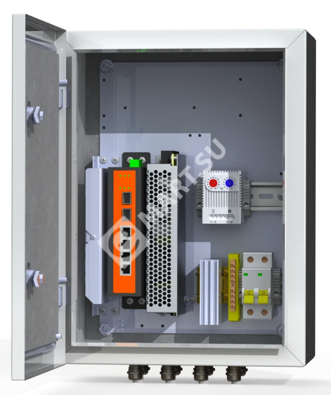 Двухполюсный защитный автомат 6А - 1 шт. Обогреватель 50Вт - 1 шт. Сдвоенный термостат - 1 шт. Блок питания 150Вт -1 шт. Промышленный неуправляемый коммутатор 4*PoE 802.3 af/at (бюджет 140 Вт), 2*SFP - 1 шт. Оптический кросс 4 порта SC/SM - 1 шт. Гермовводы 4*PG9, 4*PG13,5 -1 комплект.