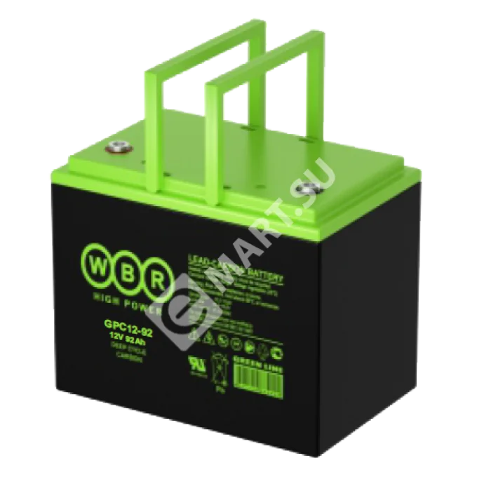 Аккумулятор WBR GPC12-92 - герметизированная, карбоновая, свинцово кислотная, аккумуляторная батарея с увеличенным до 15 лет сроком службы или более 1900 расчетных циклов заряда-разряда в циклическом режиме при 70% разряде. Эта высокоэффективная, перезаряжаемая батареи, не требующая обслуживания в течение всего срока службы и за счет использования чистого свинца, а также добавки углерода в состав электродов получили улучшенные зарядные и разрядные характеристики.