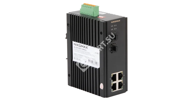 Неуправляемый промышленный коммутатор NIKOMAX, 4*10/100/1000Мбит/с PoE (af/at/BT), 2*1Гбит/с SFP, крепление на DIN-рейку, 2*ввода питания, питание 44-57В (блок питания 240Вт поставляется отдельно), -40С +75С.